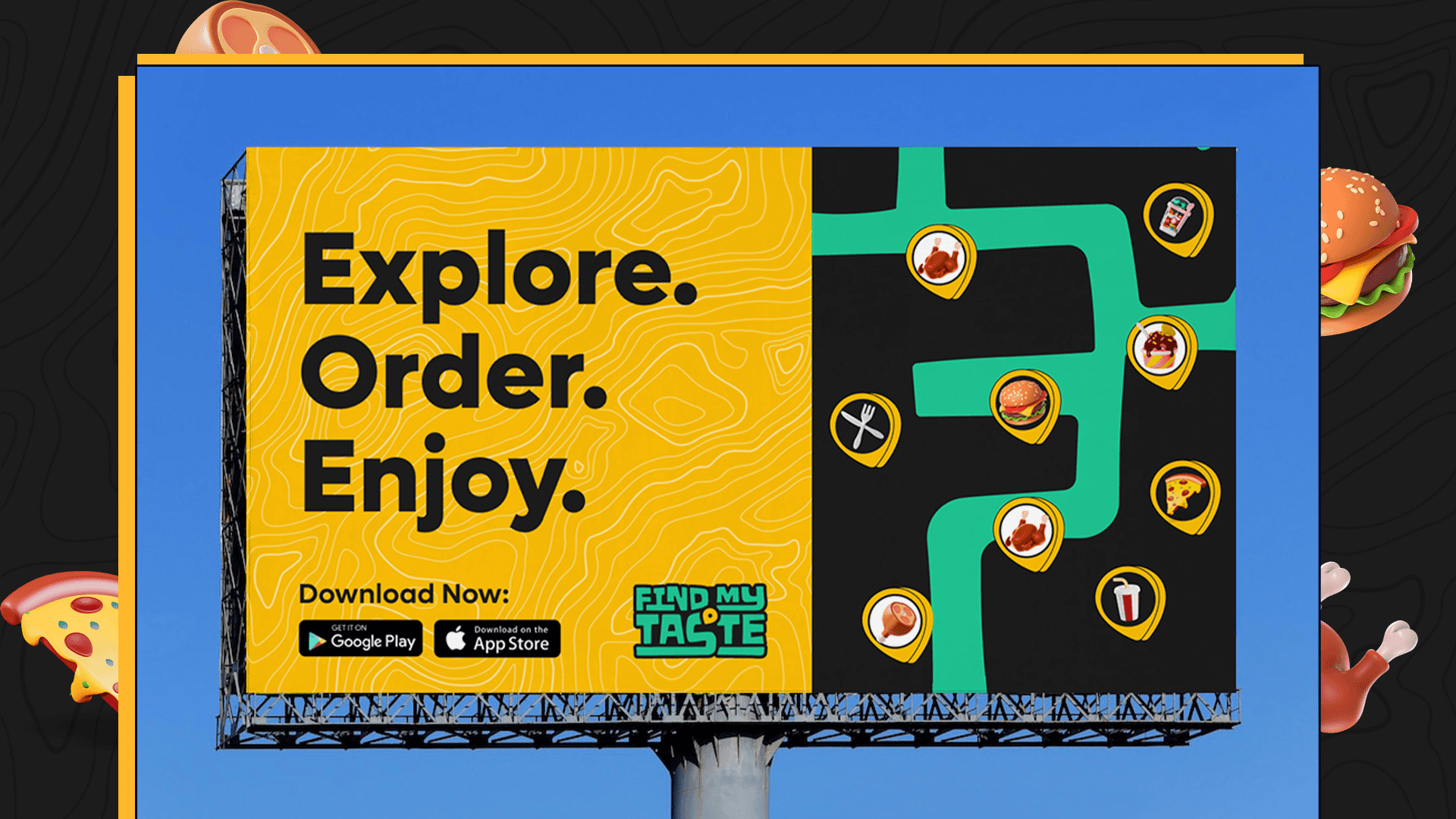 I developed a bold yet flexible identity system anchored on a clean, modern logo mark. The color palette blends energetic tones with accessibility-focused contrast, while the type system is friendly and legible across digital and print. Each visual element was chosen to feel human, local, and easy to connect with — supporting the brand’s "Explore, Order, Enjoy" value proposition.